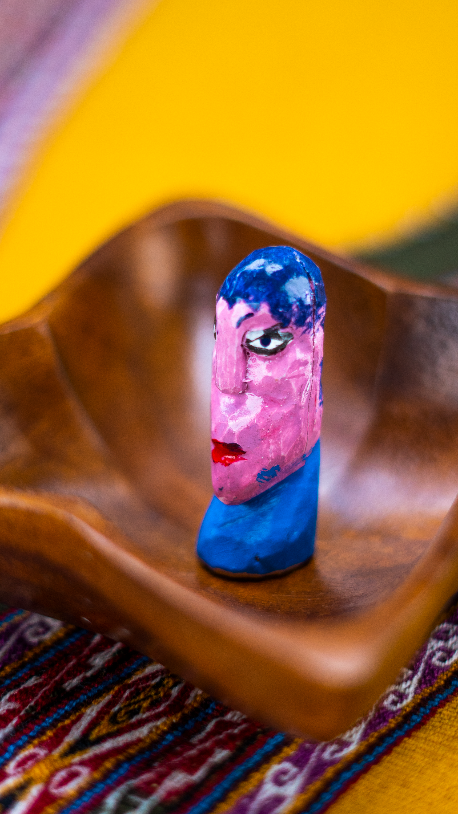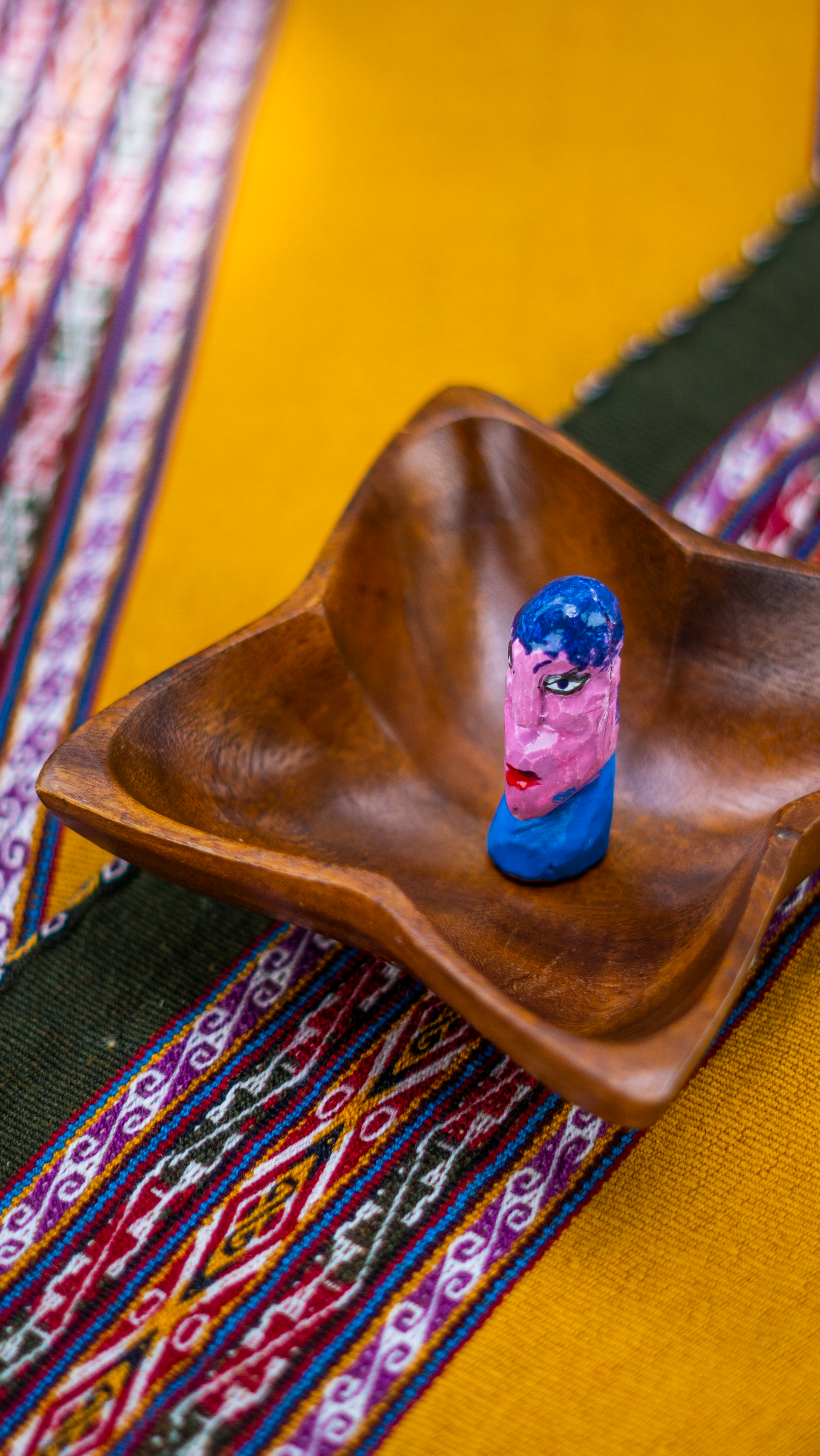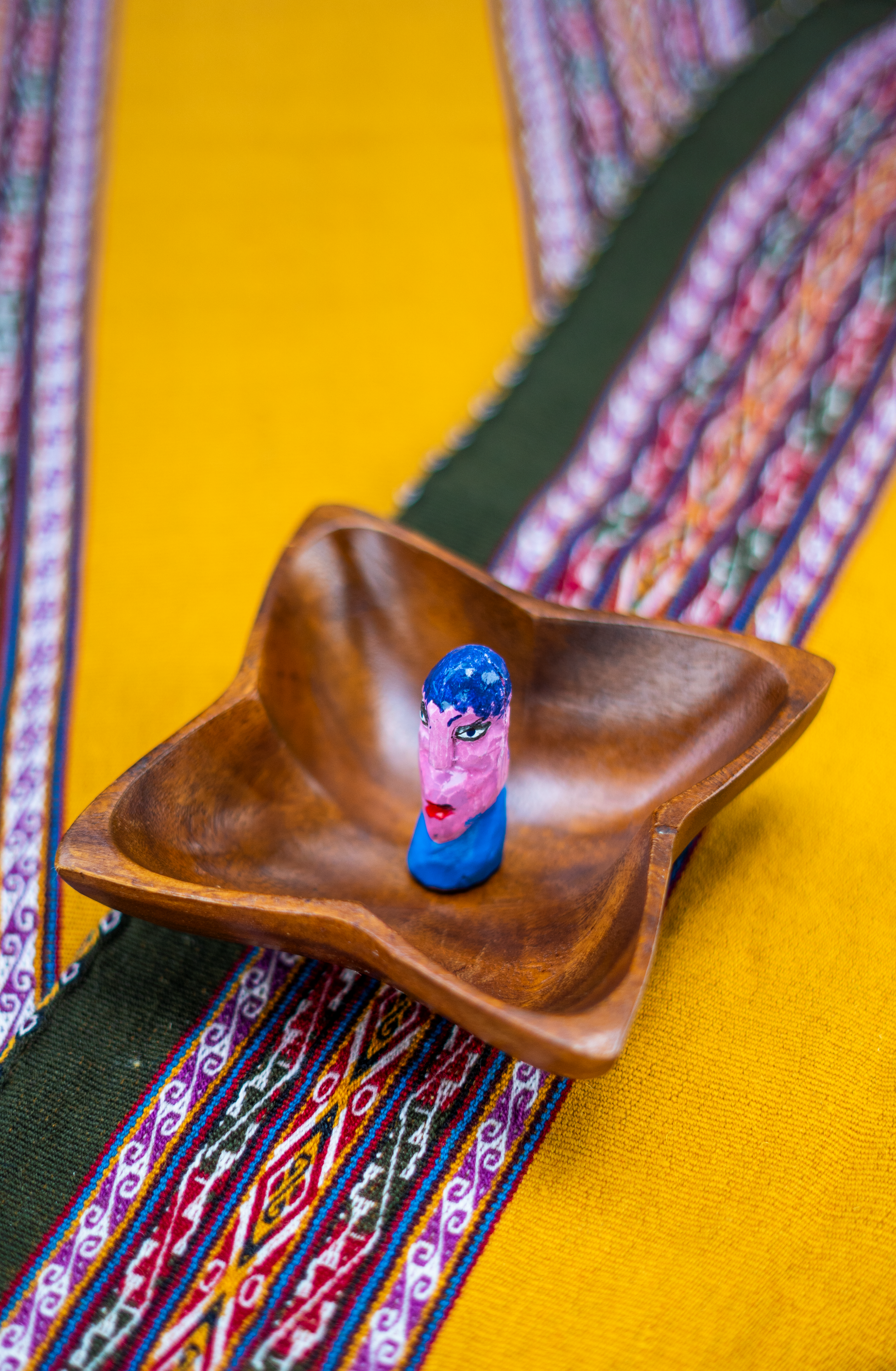Mid century walnut bowl with handmade figurine carved by artist Cayuco from Miches, Dominican Republic.